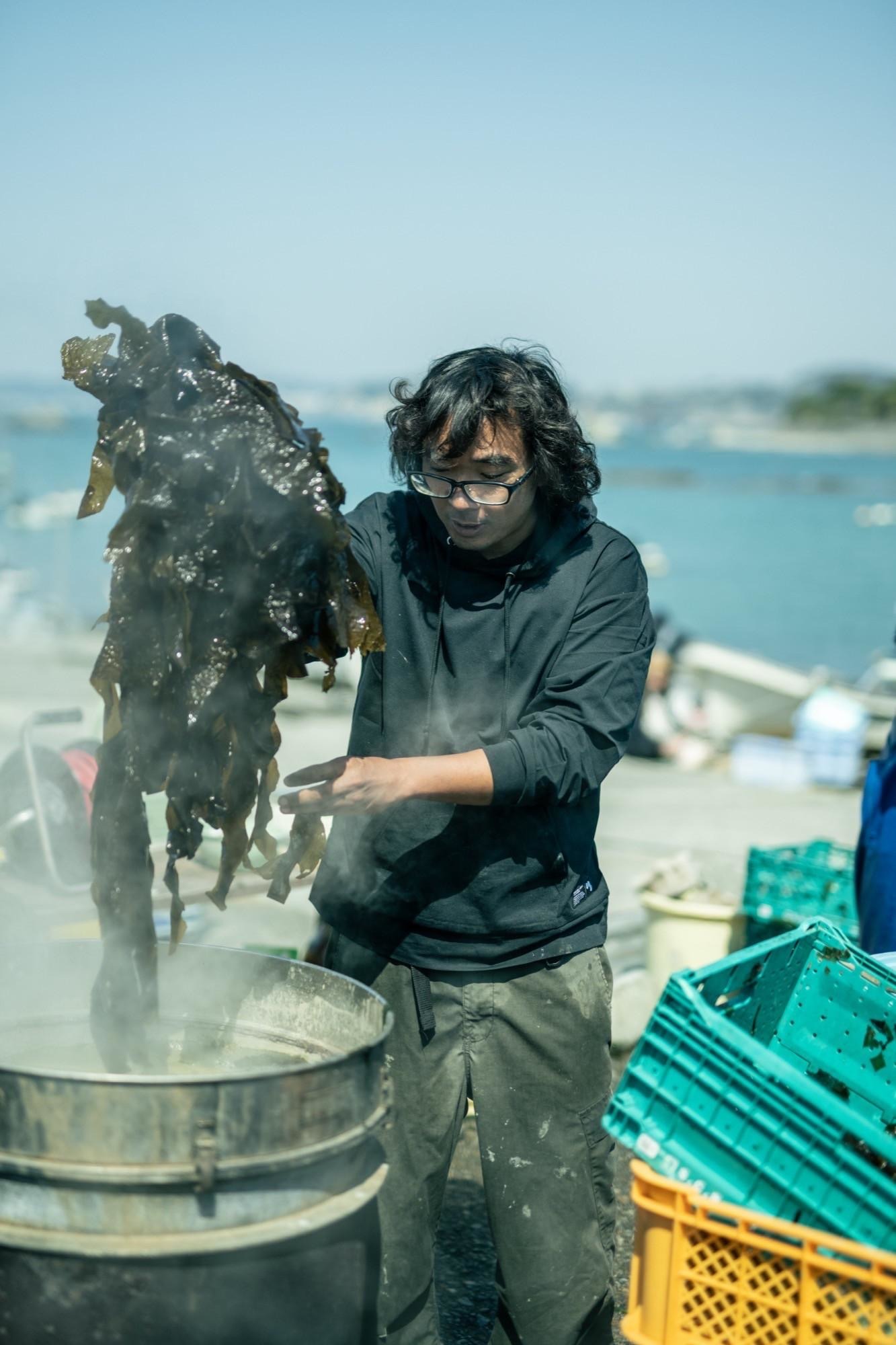 ワカメを釜茹でする漁師さん